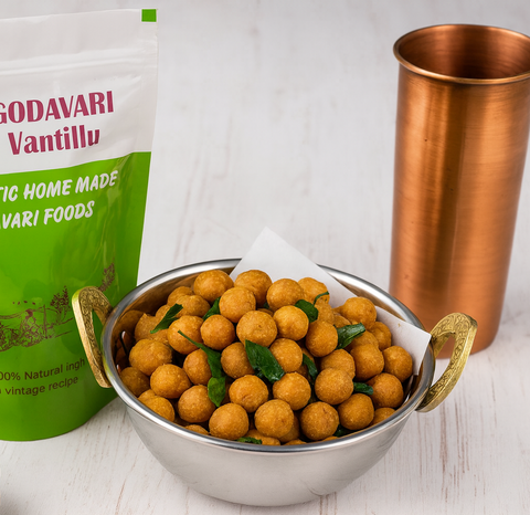 Straight from the heart of Godavari districts, this nostalgic snack once filled every home with its irresistible aroma and crunchy goodness. A timeless favorite from the 1980s, lovingly revived by Godavari Vantillu so you can relive those golden childhood memories.